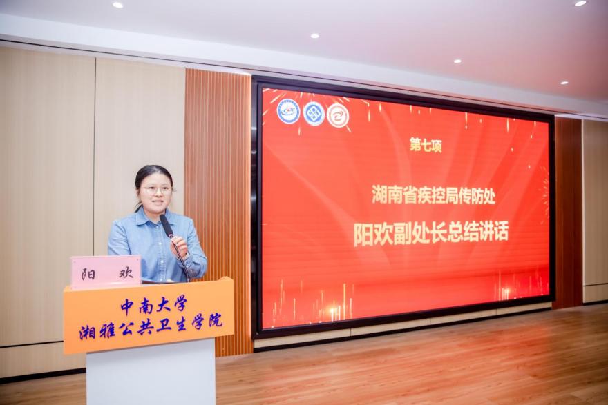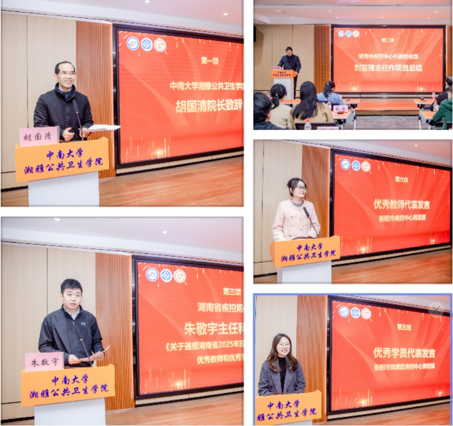 2025年11月26日下午,湖南省2025年现场流行病学培训项目结业典礼在中南大学湘雅公共卫生学院举行。湖南省疾病预防控制局传染病防控处副处长阳欢、四级主任科员朱敬宇,湖南省疾病预防控制中心科教国合部主任刘富强、主任医师李飞跃,中南大学湘雅公共卫生学院院长胡国清、党委委员尹逊强出席结业典礼。来自湖南省各市州疾控中心科教部门的负责人、优秀教师代表与60名项目学员共同齐聚,见证这一重要时刻。结业典礼由尹逊强主持。