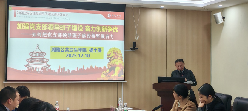 12月10日,中南大学湘雅公共卫生学院党委、分党校在学院203会议室举行2025年党支部书记、副书记集中培训会。本次培训以“提升履职能力、推动党建与业务双创双融”为主题,通过党课学习、经验分享、观看视频、专题研讨和实践学习等多种形式,切实强化基层党组织“头雁效应”,为加快建设高水平公共卫生学院提供坚强组织保障。学院党委书记雷先阳出席并讲话,党委副书记王超主持会议,学院各党支部书记、副书记参加培训。