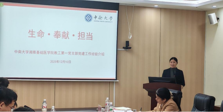 随后,湘雅基础医学院教工第一党支部书记陈旦以《生命 奉献 担当——中南大学湘雅基础医学院教工第一支部建设经验介绍》为题,分享其所在支部创建教育部第三批“全国党建工作样板支部”并于2024年11月顺利通过验收的实践经验。她结合教学科研与社会服务中的具体案例,生动展示了党建如何赋能业务发展,实现“一个支部一座堡垒,一名党员一面旗帜”的实践案例。