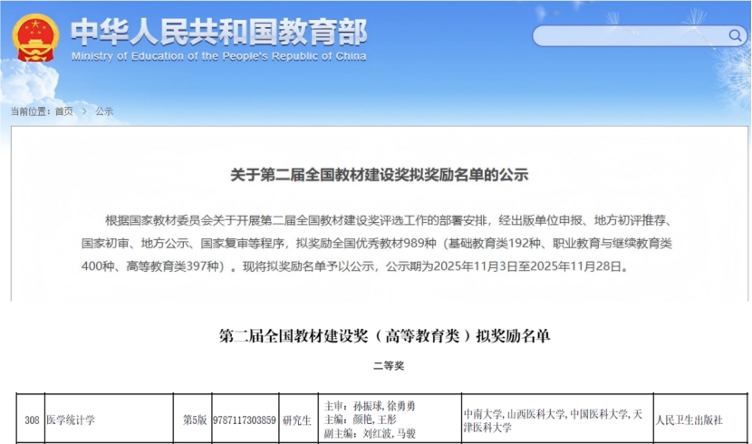 近日,由我院二级教授、流行病与卫生统计学博士生导师颜艳担任第一主编的国家卫生健康委员会“十三五”研究生规划教材《医学统计学》(第五版),荣获第二届全国教材建设奖(高等教育类)二等奖。