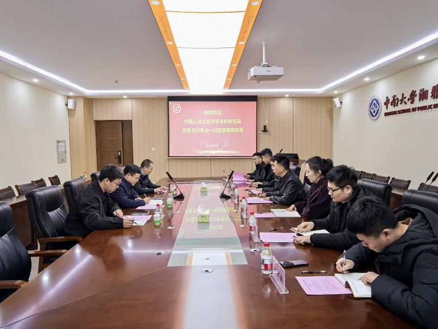 2026年1月29日,中国人民公安大学本科新生院党委书记一行来到中南大学湘雅公共卫生学院,与湘雅公共卫生学院进行交流座谈。湘雅公共卫生学院党委书记雷先阳、党委副书记王超,中国人民公安大学本科新生院党委书记李治、副院长杨蓉、党委委员盛旭、党委委员胡宝荣等出席会议。会议由王超主持。