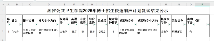 附:湘雅公共卫生学院2026年博士招生快速响应计划复试结果