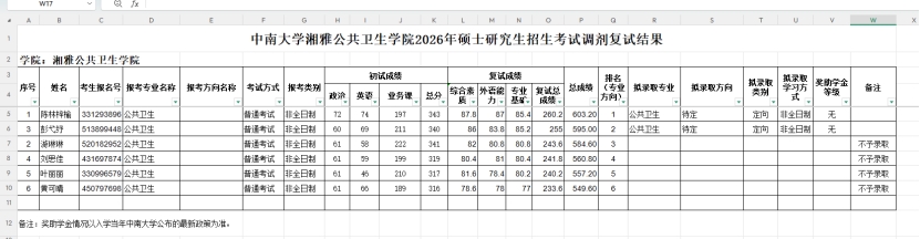 根据中南大学2026年硕士研究生招生复试录取工作方案,以及我院2026年非全日制公共卫生硕士(MPH)研究生招生调剂复试录取工作方案,陈林梓榆等6名考生获得调剂复试资格。经学院专家组复试、领导小组审核,陈林梓榆等2名考生获得非全日制公共卫生专业硕士拟录取资格,现公示如下。